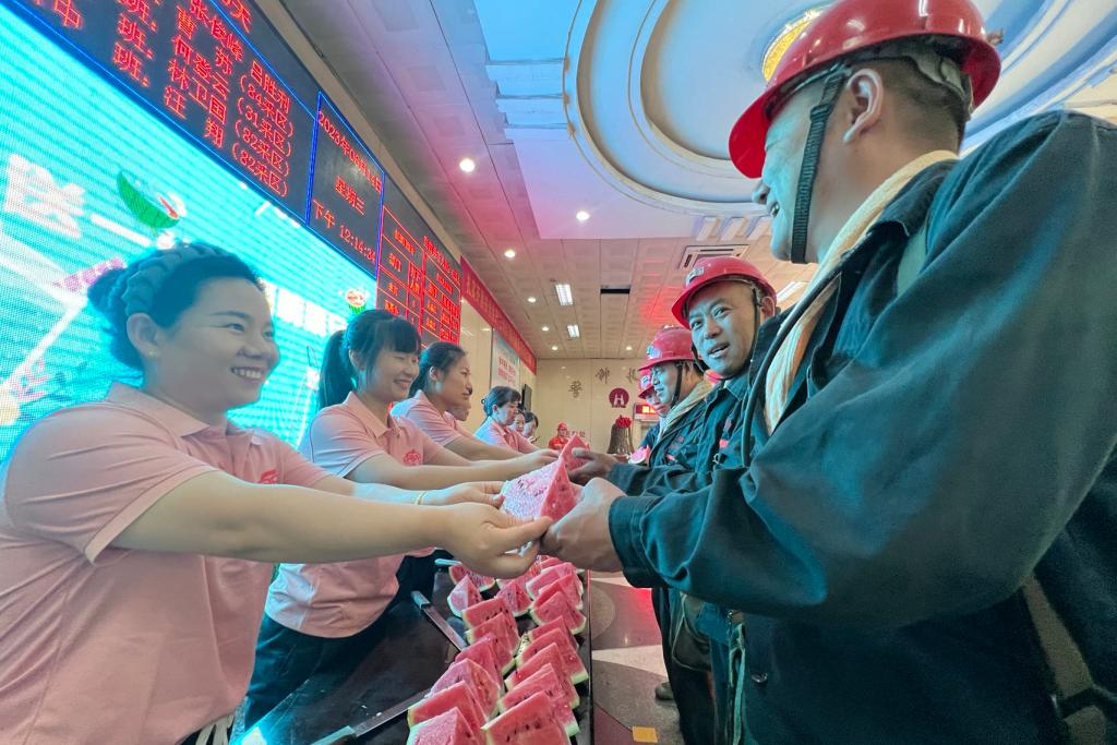 協安員在井口大廳為升、入井的職工師傅們送上西瓜和茶水,叮囑大家做好防暑降溫,牢記安全生產,把夏日清涼送到職工的心坎上。職工們紛紛表示,一定牢記囑托,時刻注意安全,認真履職盡責,確保安全生產。(撰稿:徐燕萍 呂嬋娟  審核:鄧為)