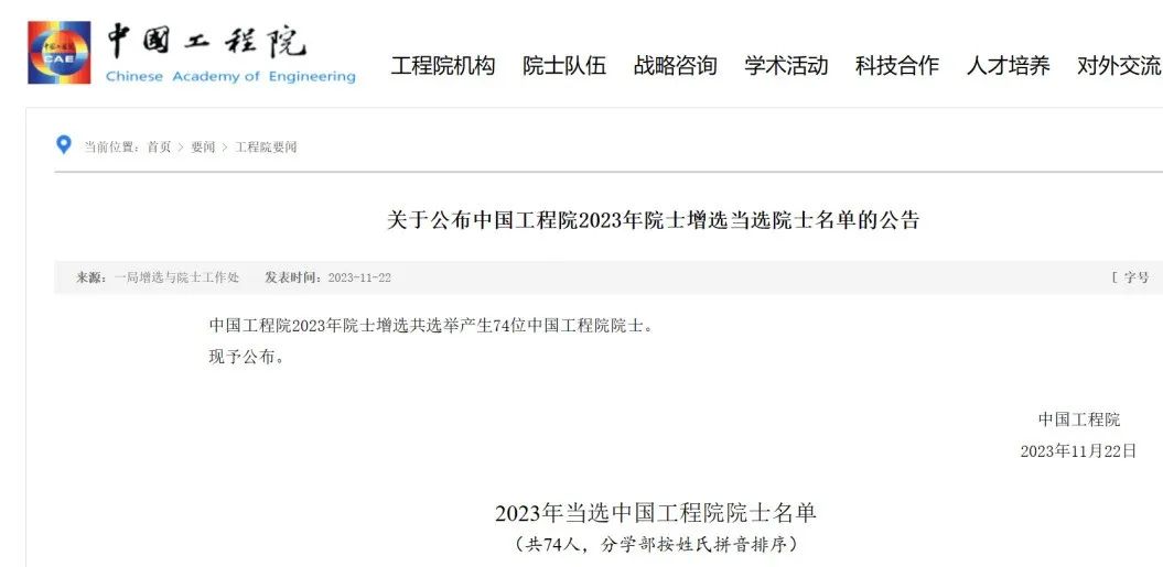 11月22日,2023年兩院院士增選結果正式揭曉,共有133人當選。中國科學院增選院士59人,中國工程院增選院士74人。煤炭領域2人當選中國工程院院士。分別是: