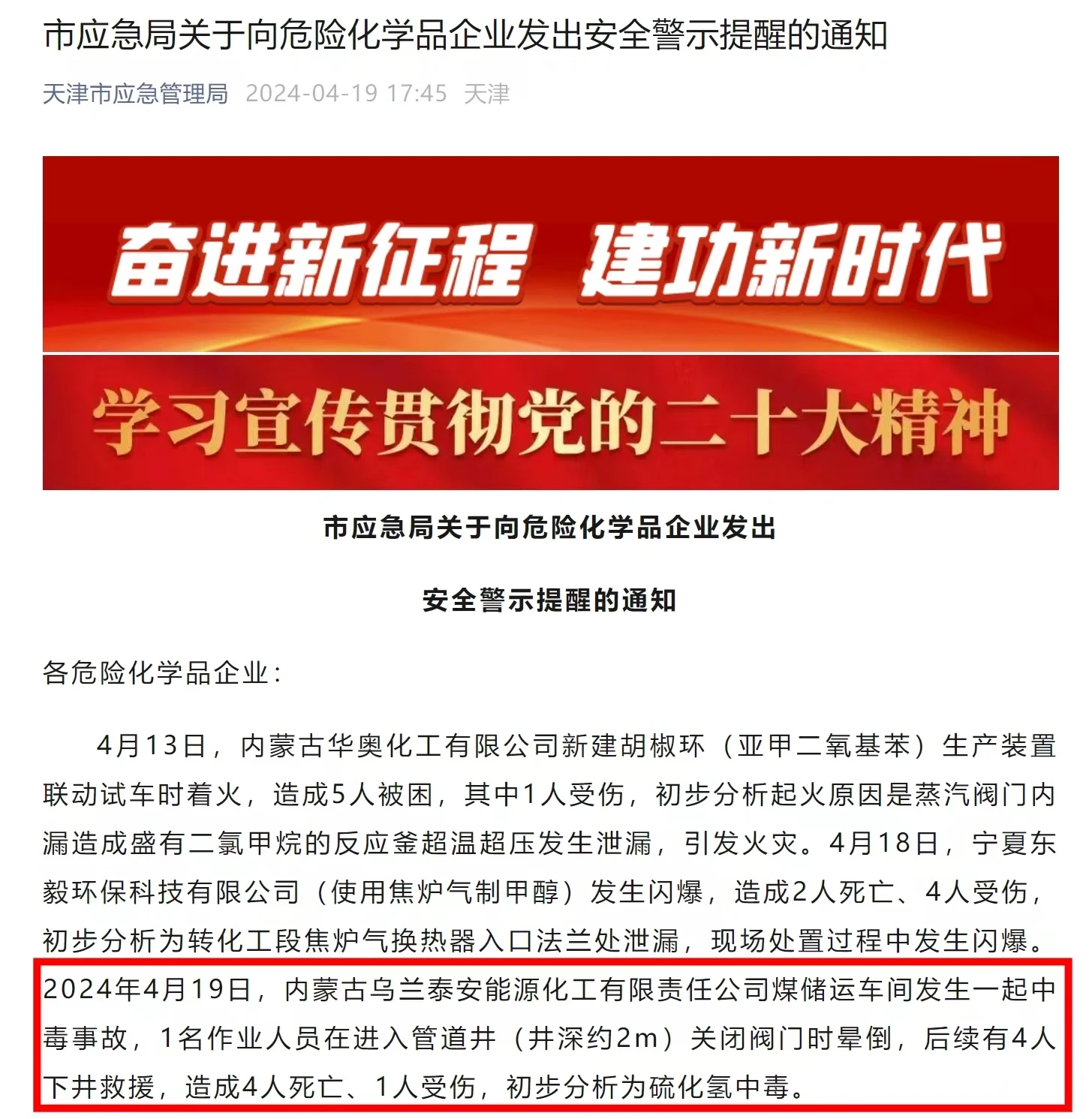 日前,天津市應急管理局向危險化學品企業發出的一則安全警示通知提到,4月19日,內蒙古烏蘭泰安能源化工有限責任公司煤儲運車間發生一起中毒事故,1名作業人員在進入管道井關閉閥門時暈倒,后續有4人下井救援。事故共造成4人死亡、1人受傷,初步分析為硫化氫中毒